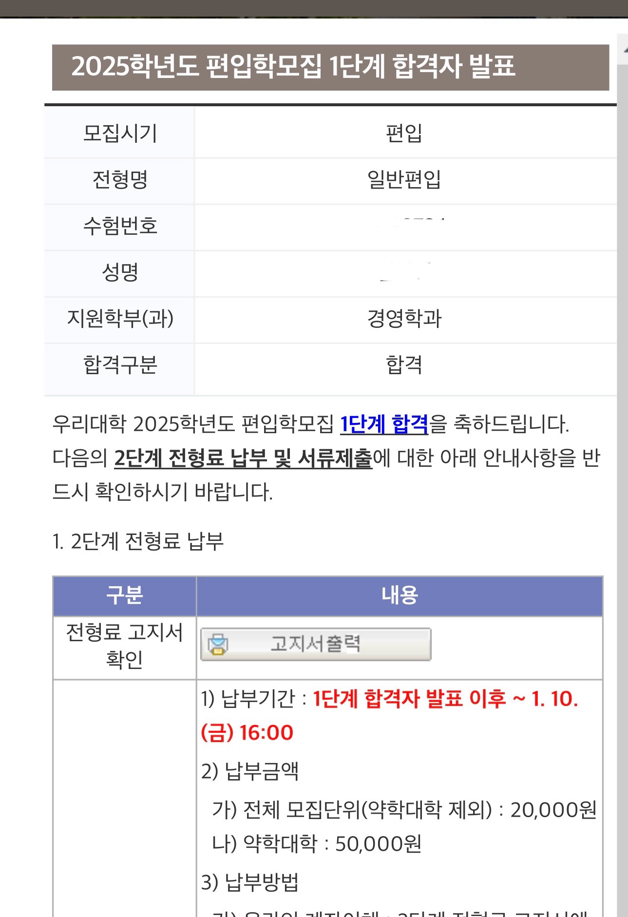 동국대 1차 합격화면