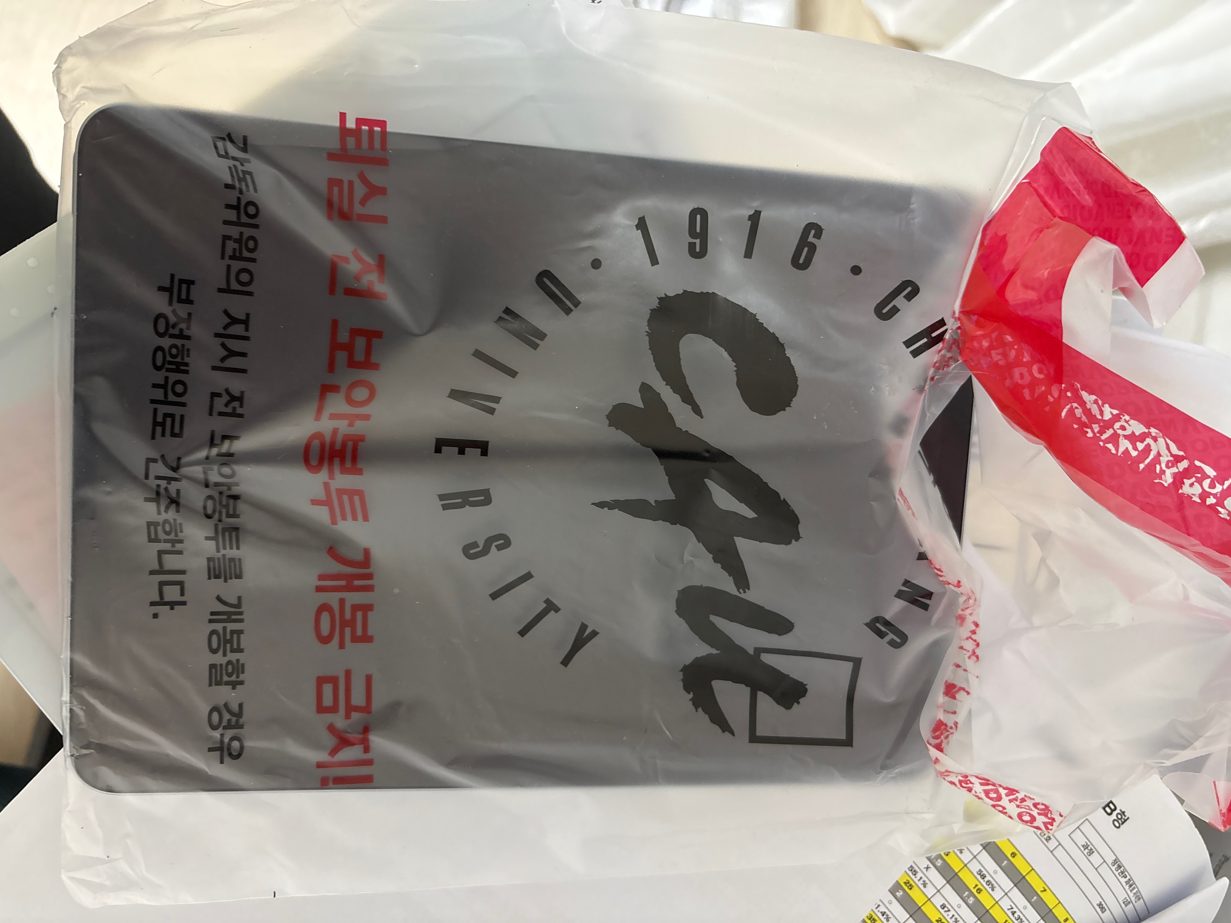 (좌) 시험보기전에는 이런 비닐 봉지에 전자기기를 수거해서 가방에 넣게 합니다 . 저거 비닐 뜯음면 빨간색 잉크가 묻어서 진짜 철저하구나 싶었습니다.